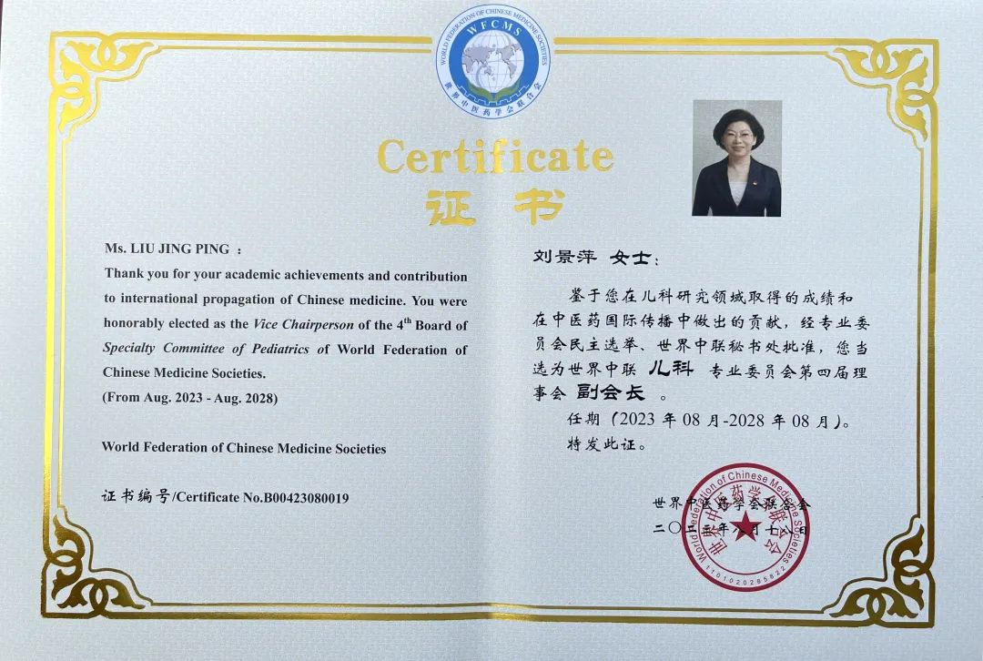 981博天娱乐药业集团党委书记、董事长刘景萍当选世界中医药学会联合会儿科专业委员会第四届理事会副会长